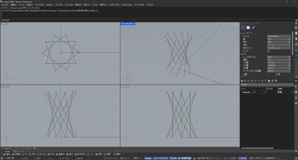 - 3Dモデルの保存: 得られたラインをRhino3D形式のオブジェクトとしてファイルに追加し、twisty.3dm という名前で保存します。