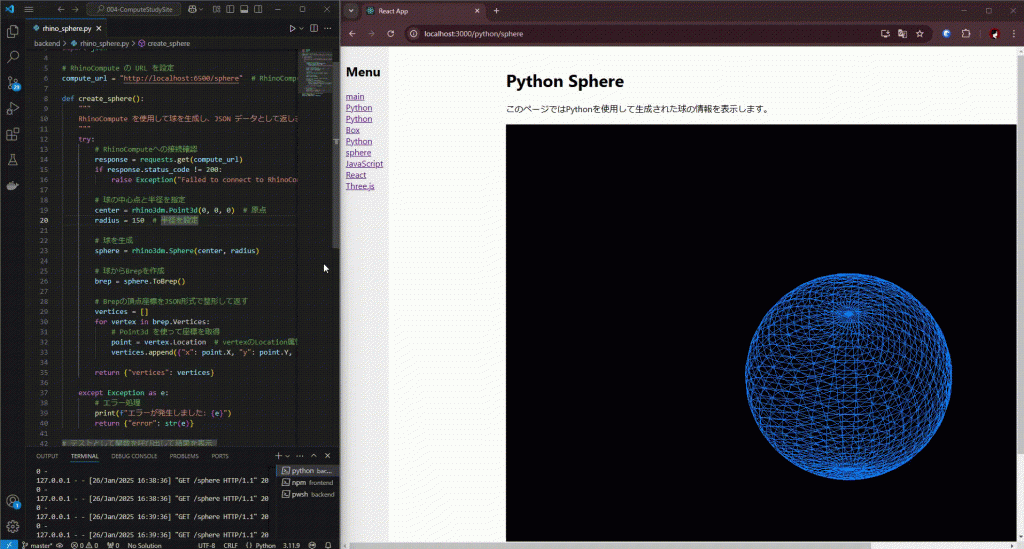以下のコードでは、ReactとThree.jsを使って、RhinoComputeのデータを基に球を描画する方法を示します。