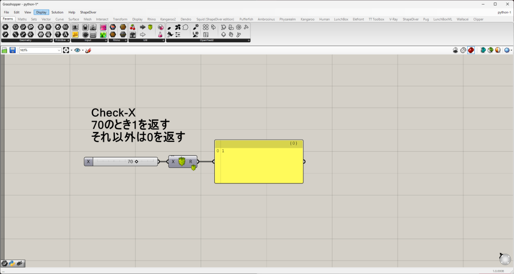 以下のコードでは、FlaskとHopsを使用して「Xの値が70であるかをチェックするコンポーネント」を作成しています。