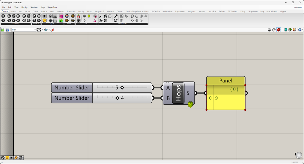 - Grasshopperを開き、Hopsコンポーネントを配置します。
