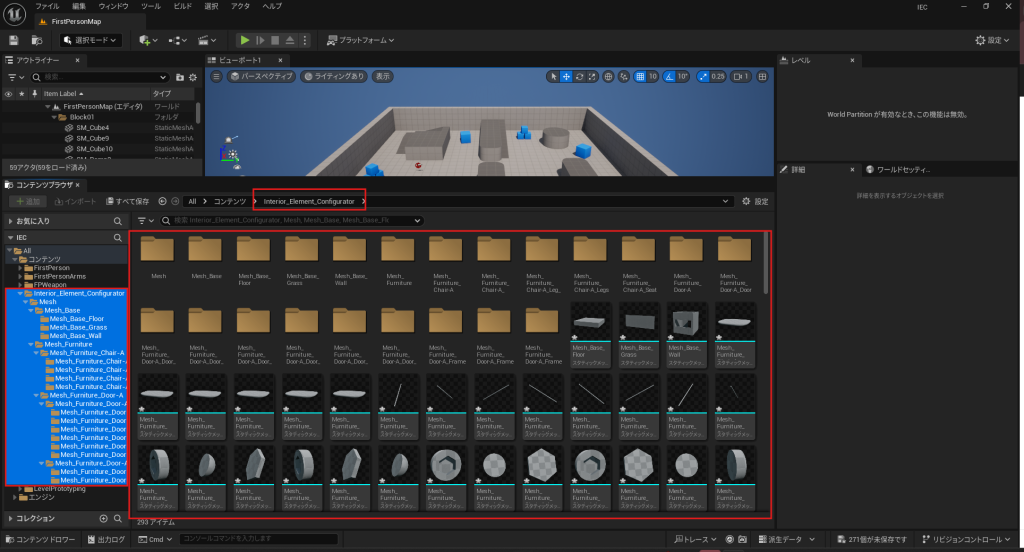 Content BrowserにInteriorElementというフォルダを作り、その中にMeshというフォルダを作ります。- 各パーツごとのフォルダを作成し、それぞれエクスポートしたFBXファイルをD&D(ドラッグ&ドロップ)でこのフォルダにインポートします。