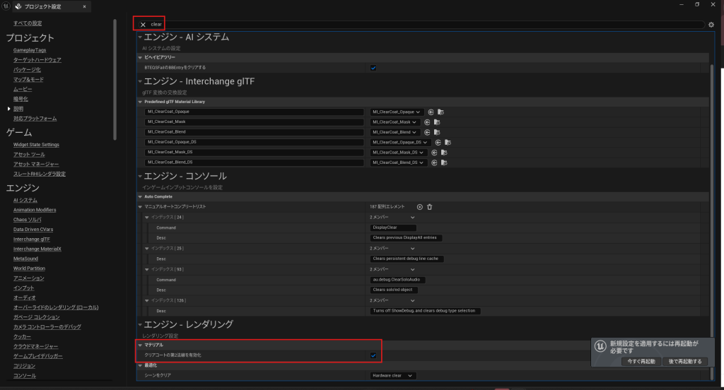 EditからProject Settingsを開きます。All Settingsにして、"Clear" と入力します。Clear Coat Enable Secondにチェックを入れます。これでマテリアルでClear Coatが使用できるようになります。- 再起動は不要です。