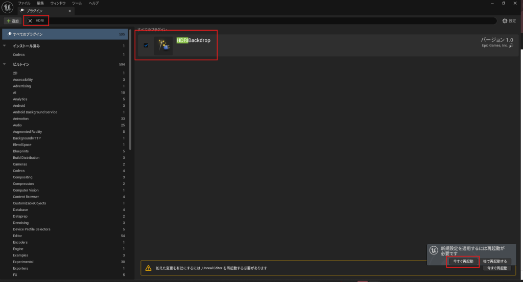 次に、Edit から Plugins を開き、"HDRI" と入力して HDRI Backdrop をオンにします。そして、再起動します。
