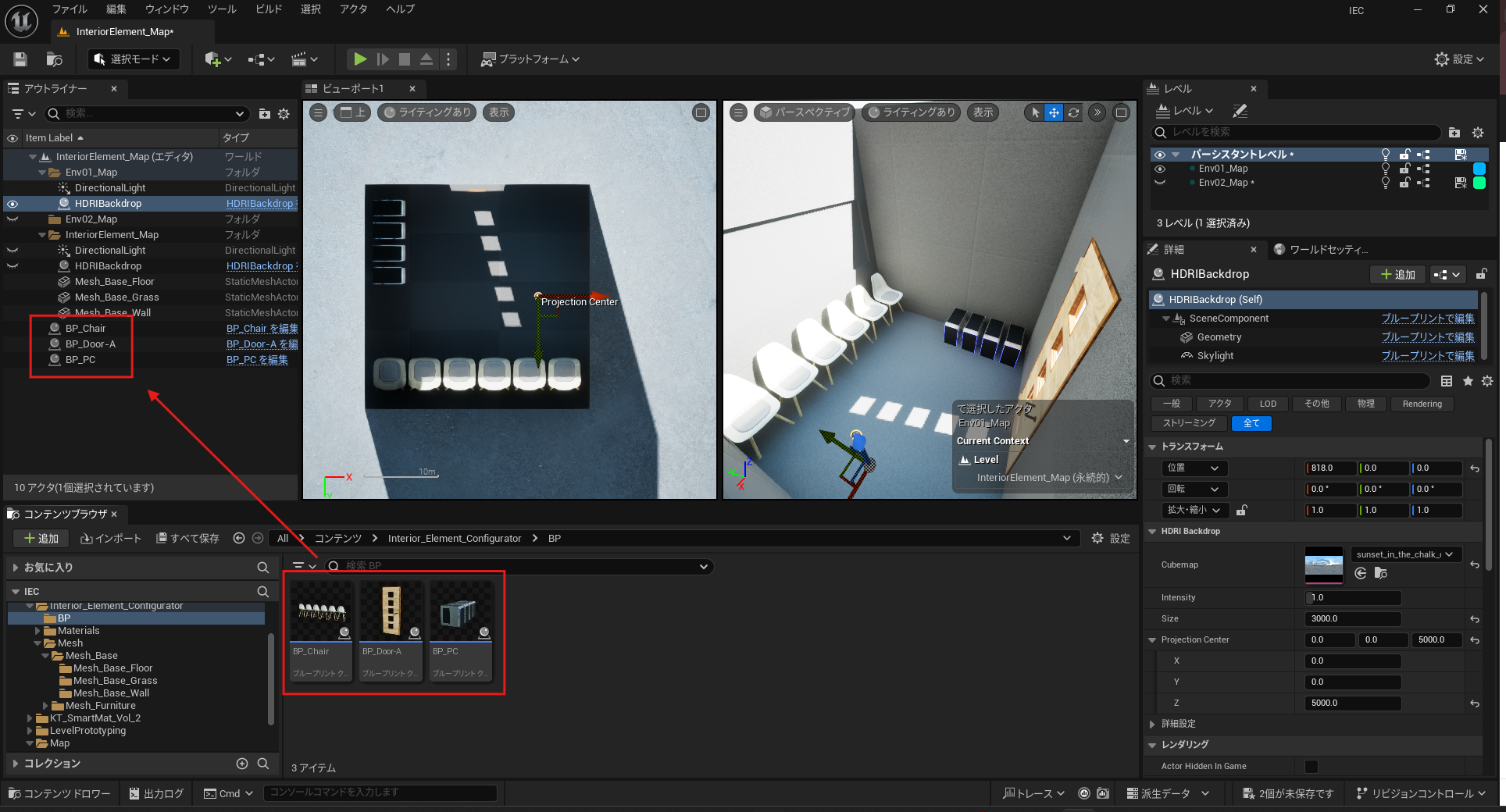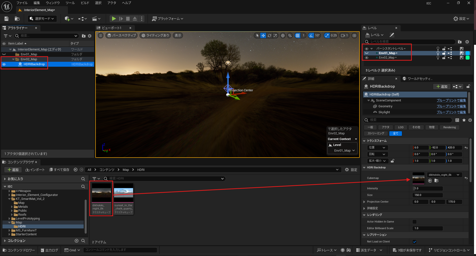 レベル(Map)の切り替えでHDRIのみ切り替わるようにしていきます。そのため、共通の要素であるモデル関係はすべてパーシスタントレベルに配置します。