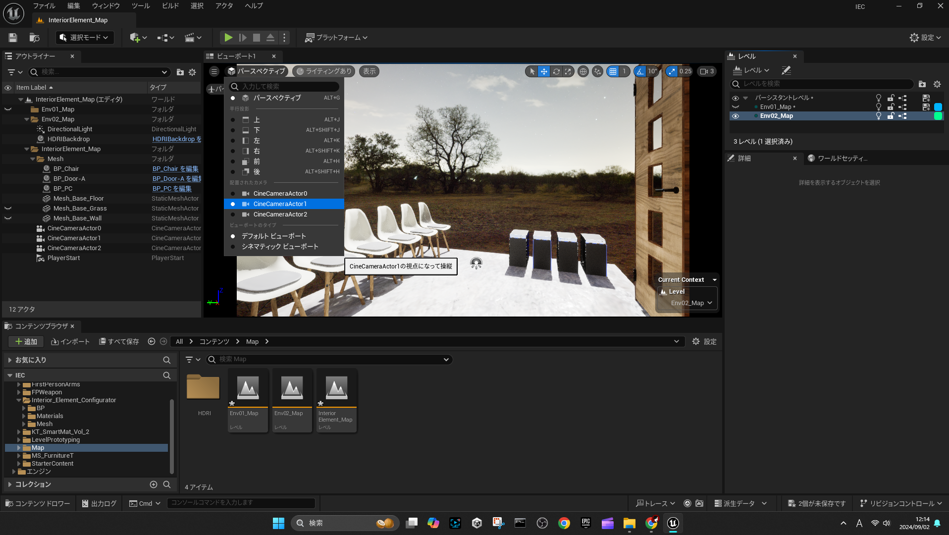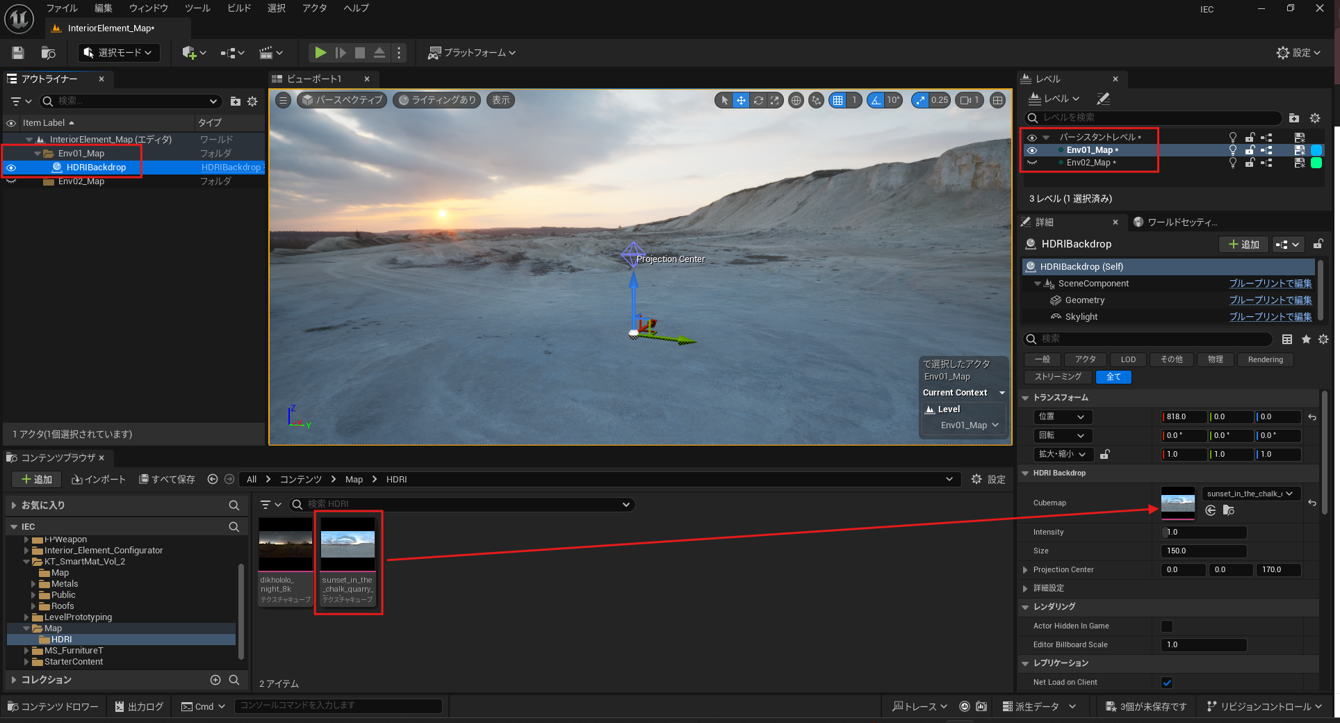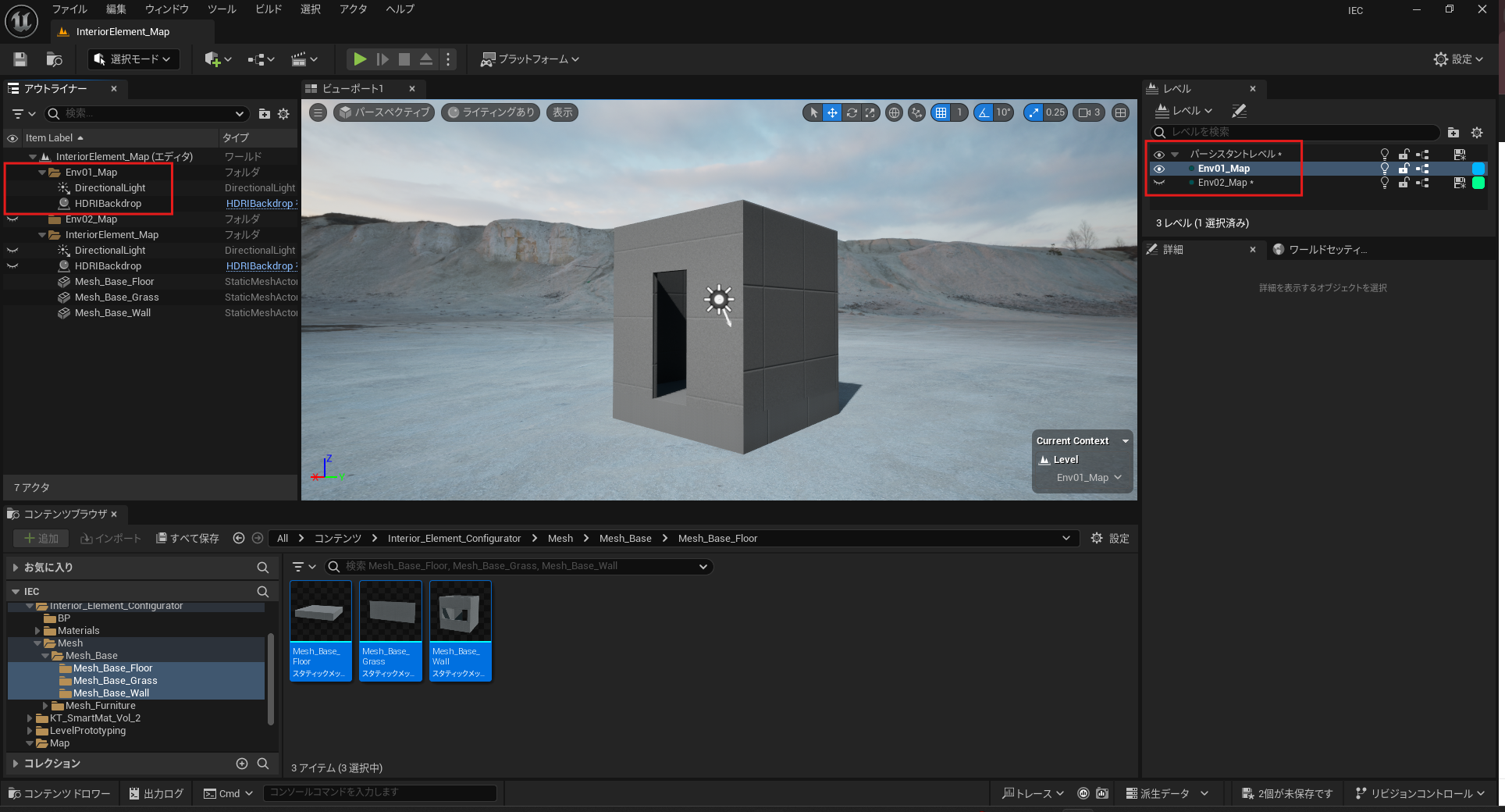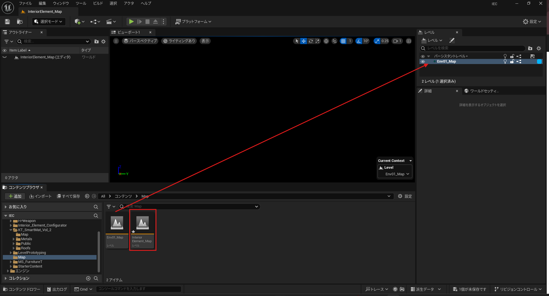 「Env01_Map」を「InteriorElement_Map」のレベルにドラッグ&ドロップ(D&D)します。これがサブレベルです。サブレベルを使用することで、複数のレベルを同時に表示したり、個別に非表示にしたり、プレイ中にロードしたりすることができます。