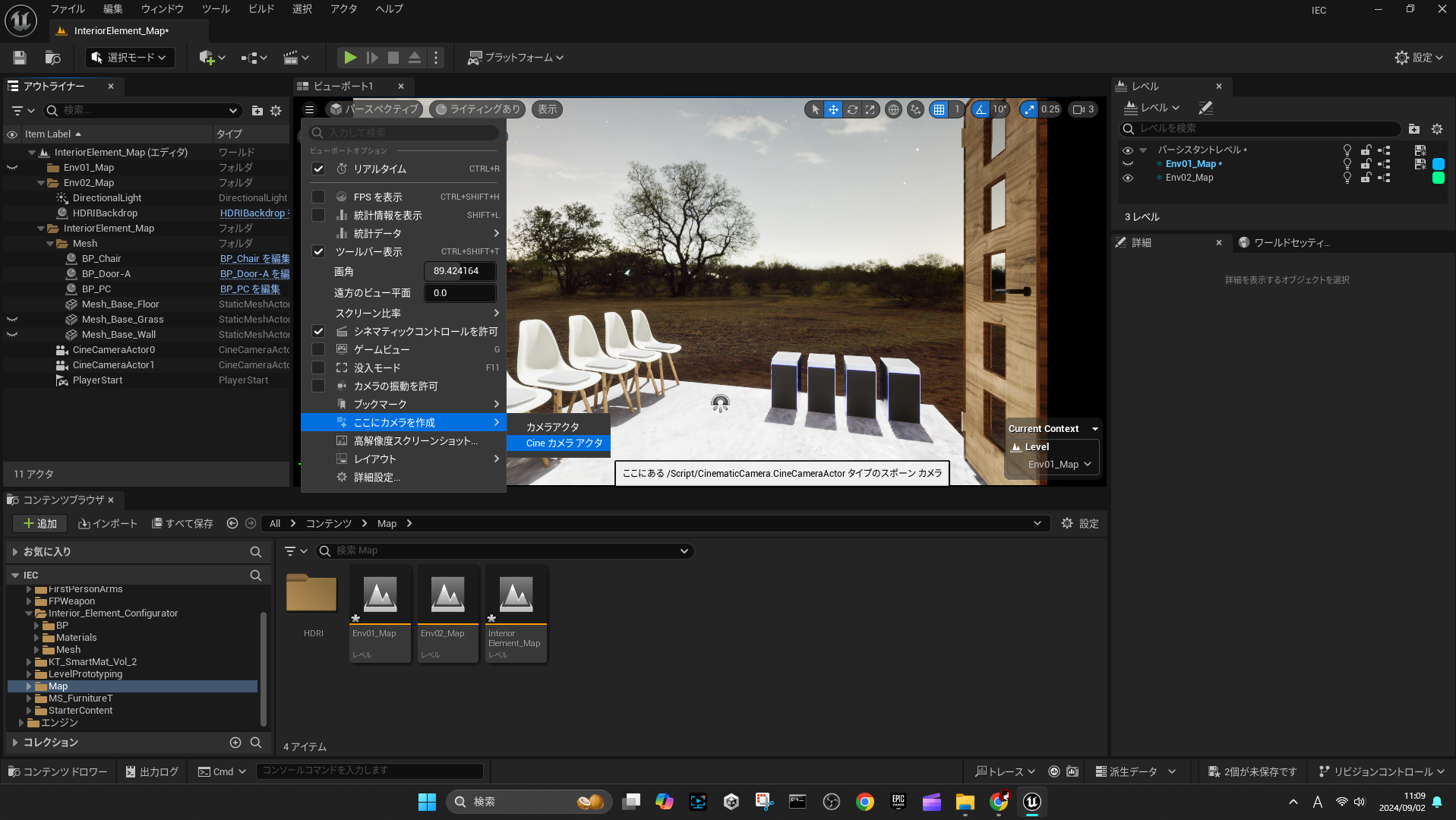 - 再び右クリックして「Level」を選択し、名前を「InteriorElement_Map」とします。このレベルにはインテリアエレメントに関連するものを配置します。