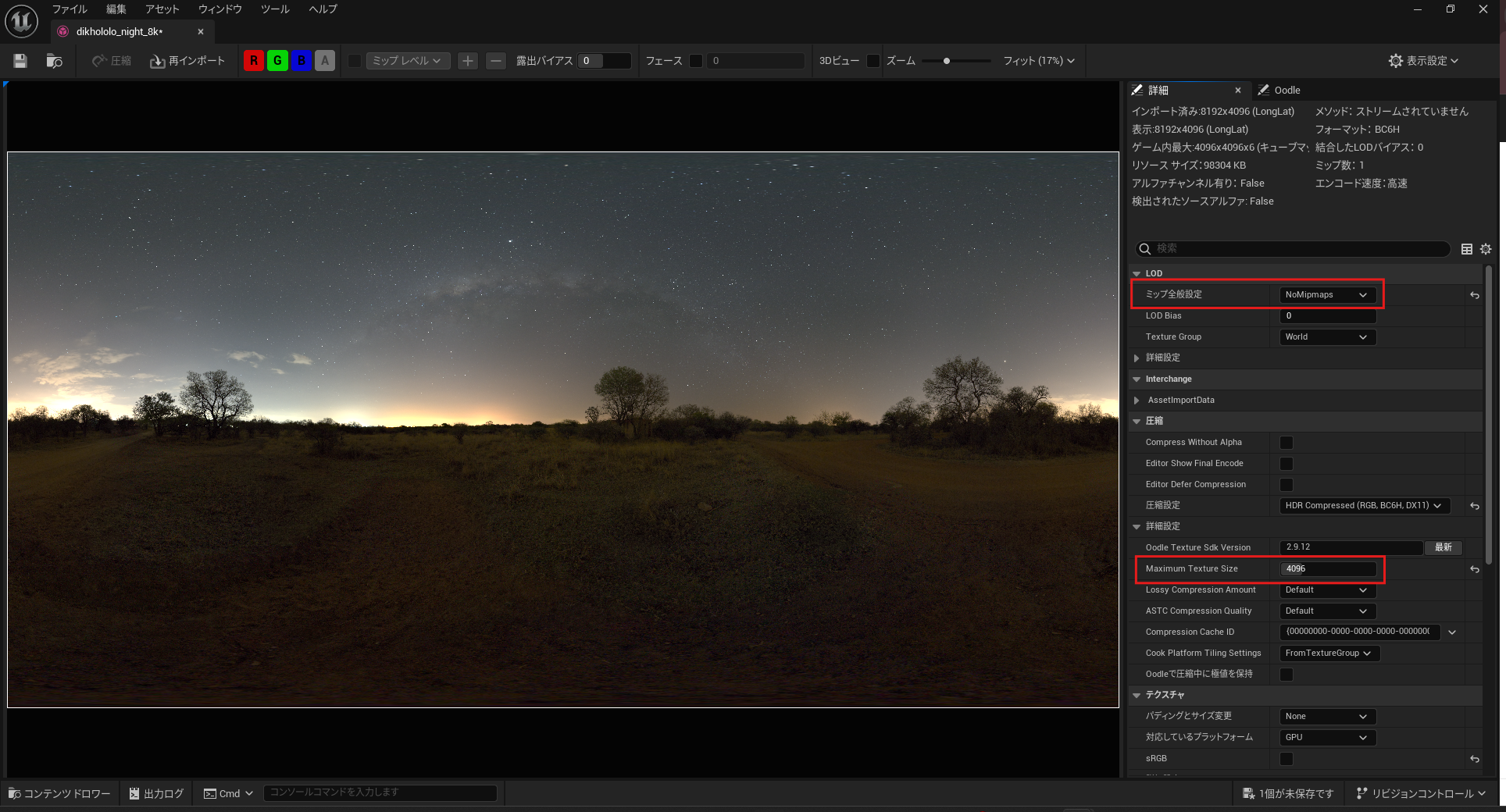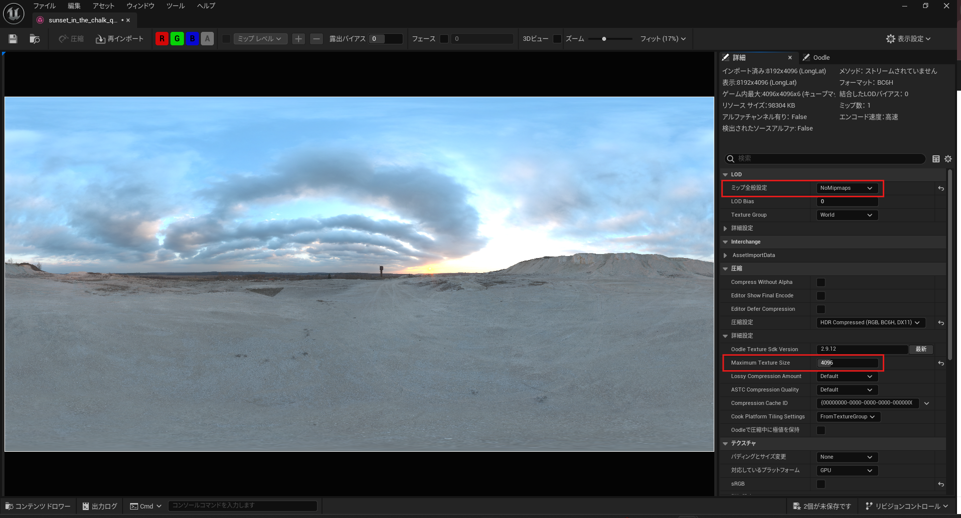 - 解像度が小さくならないように「Maximum Texture Size」を4096に設定します。また、「Mip Gen Settings」を「No Mipmaps」に設定します。