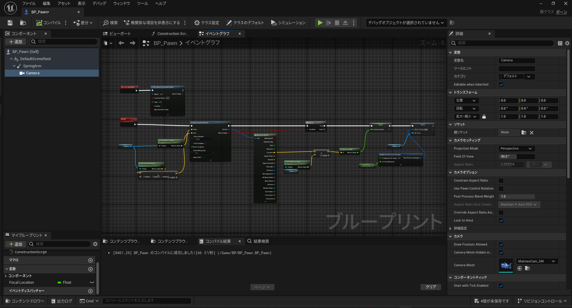 ポーンのブループリントには、キャラクターの動きやアクション、アニメーション、カメラの設定などを含めます。