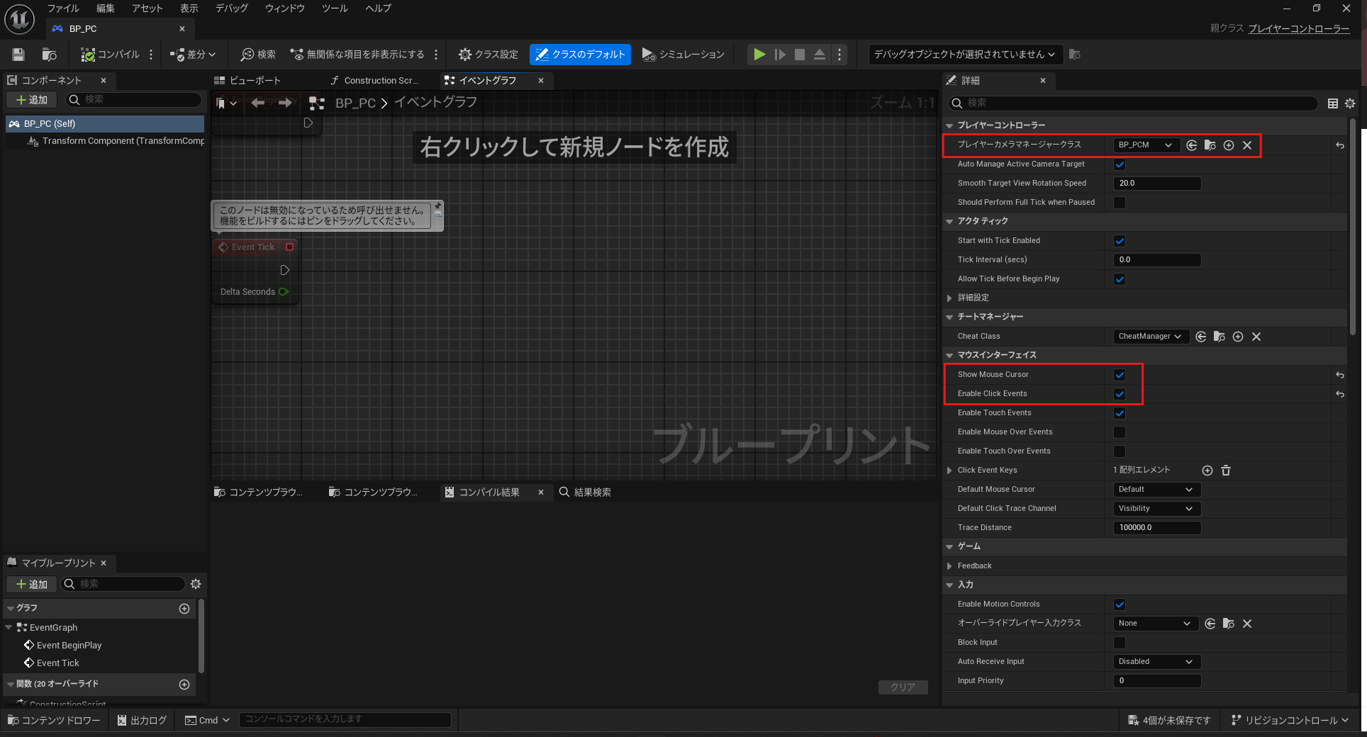 PlayerControllerブループリントクラスを作成し、プレイヤーの操作に関連するロジックを定義します。