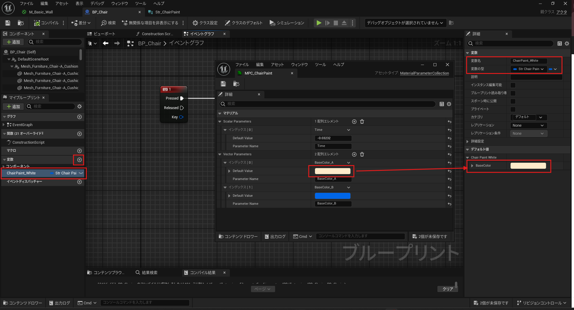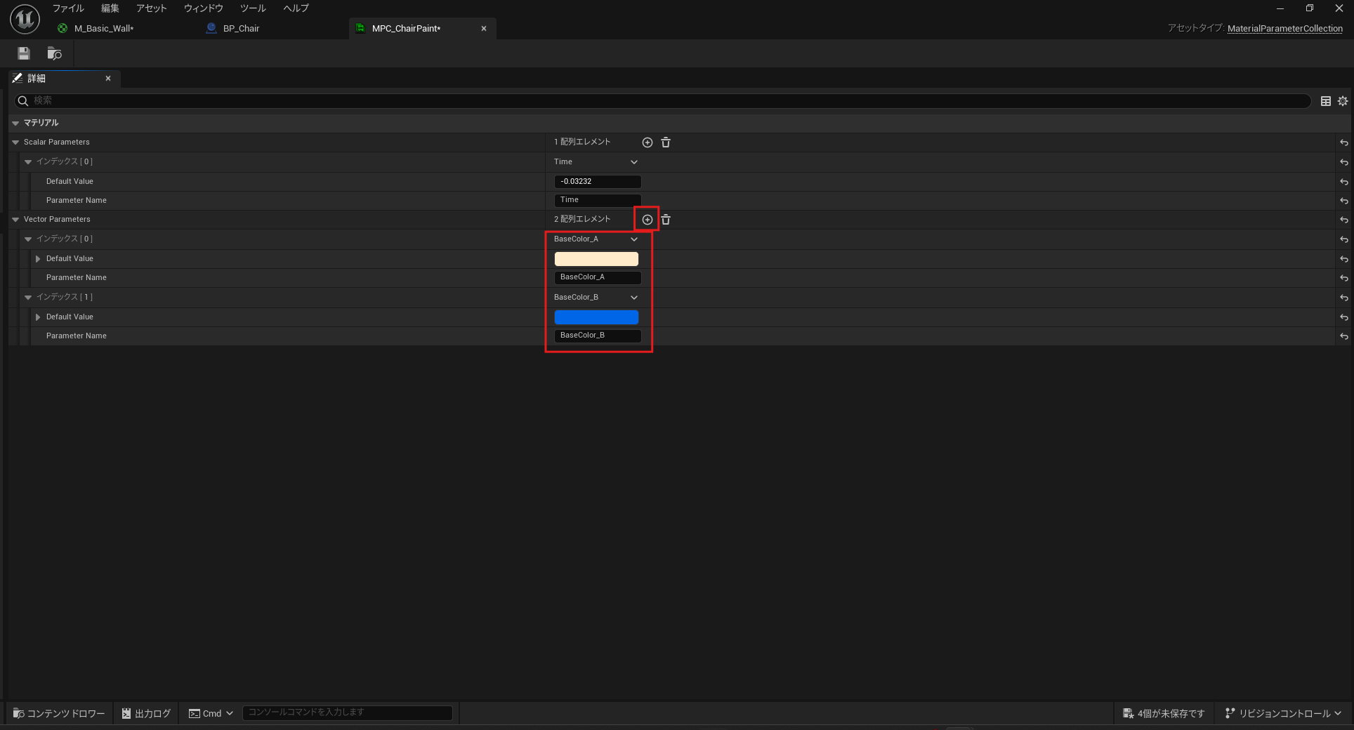 - "MPC_ChairPaint"を開いてVector Parametersを追加します(名前: BaseColor_AとBaseColor_B)。
