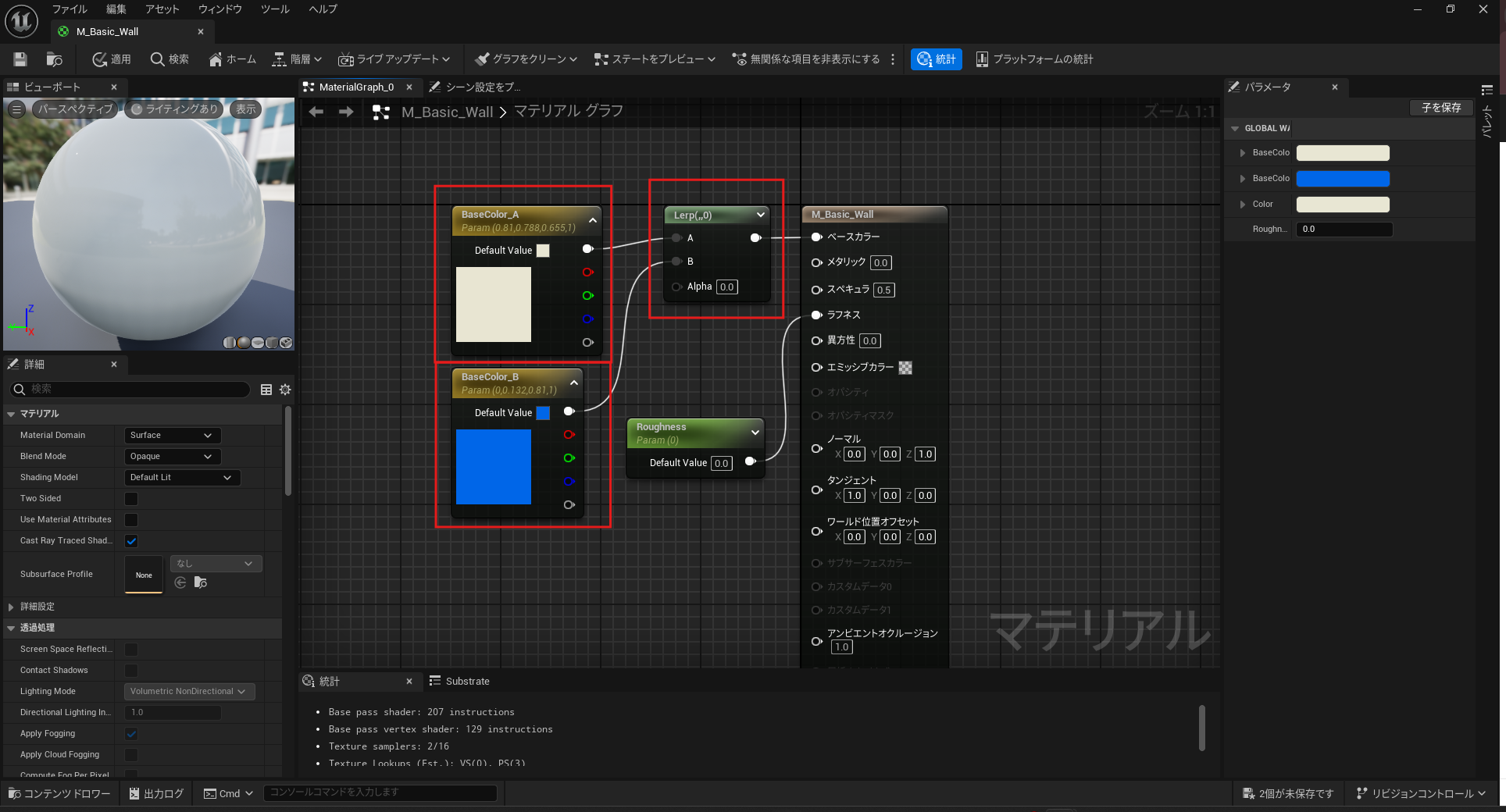 - BaseColor_AとBaseColor_Bを設定し、BaseColor_Bを適当な青に設定します。