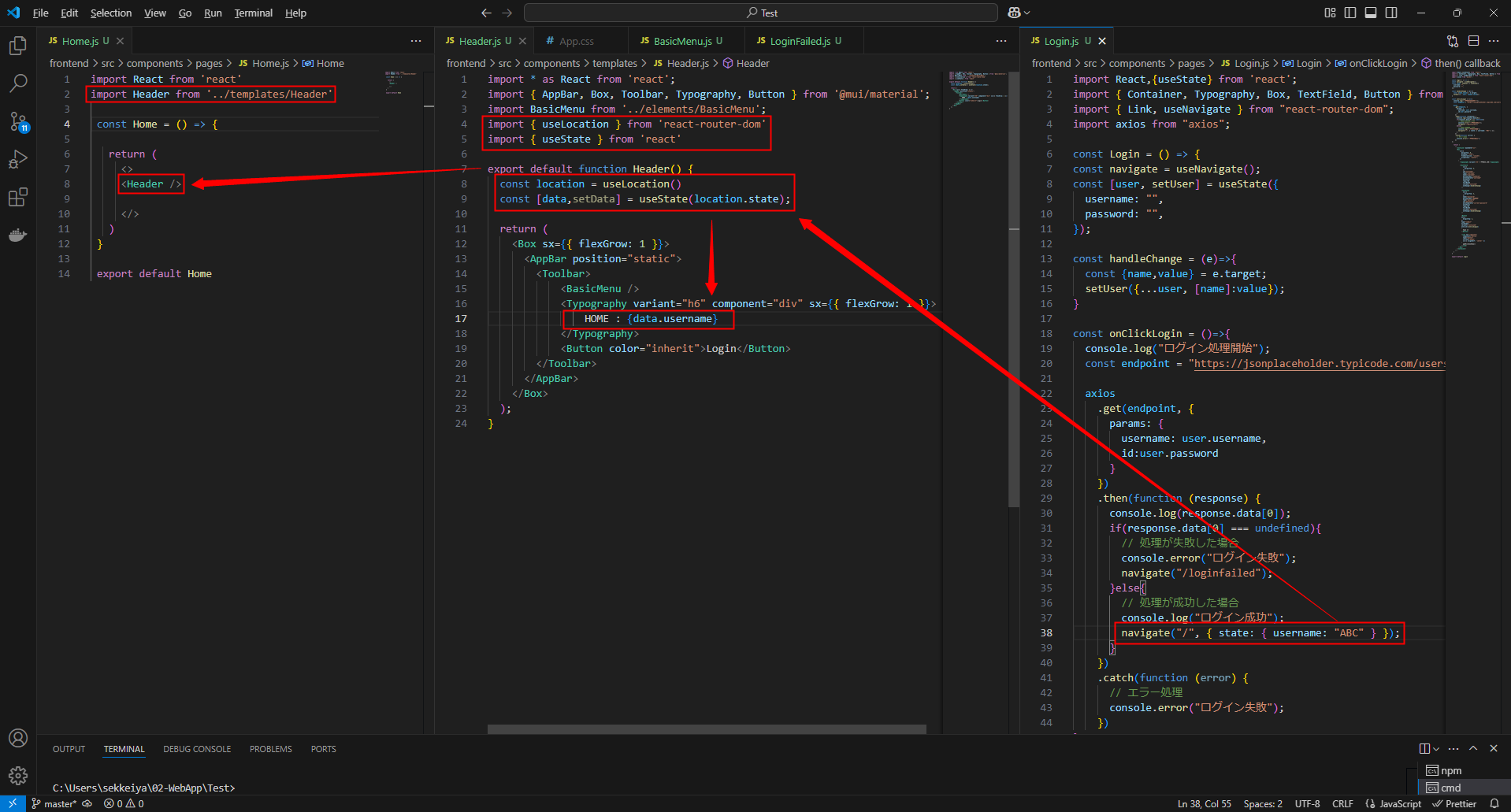navigate("/", { state: { username: "ABC" } }); #追記 navigateを使って"/"(Home)に遷移し、stateに username: "ABC" を渡す