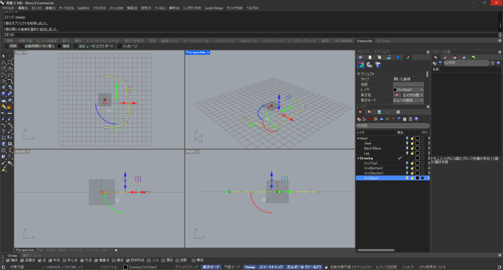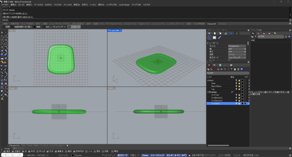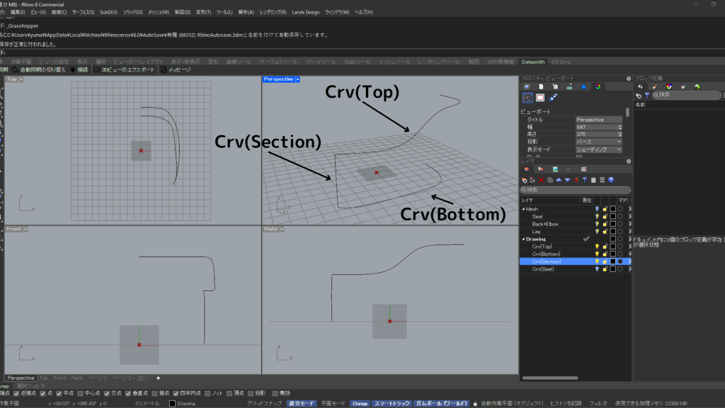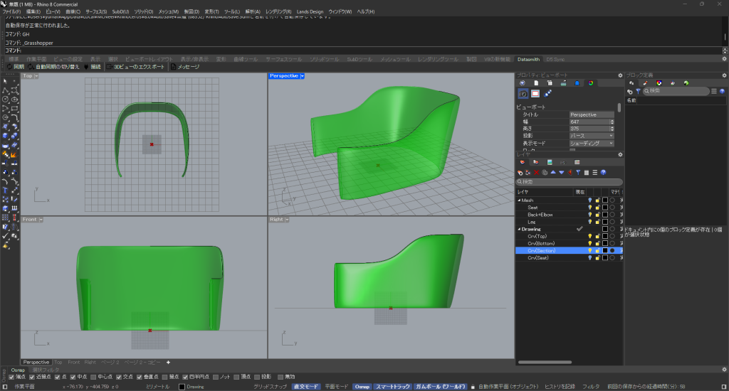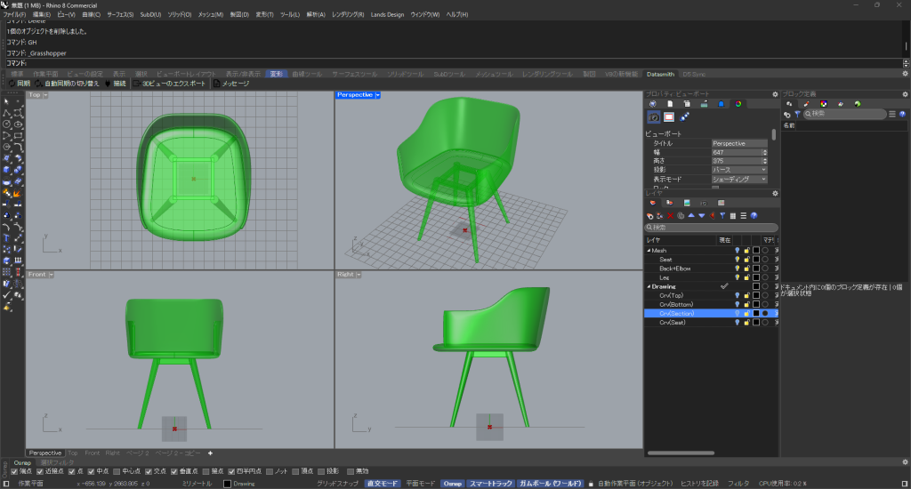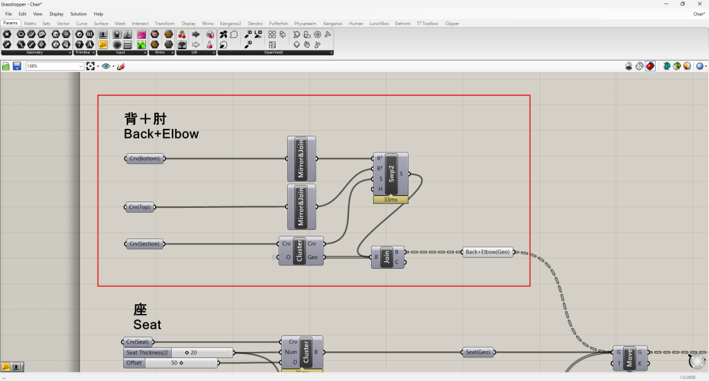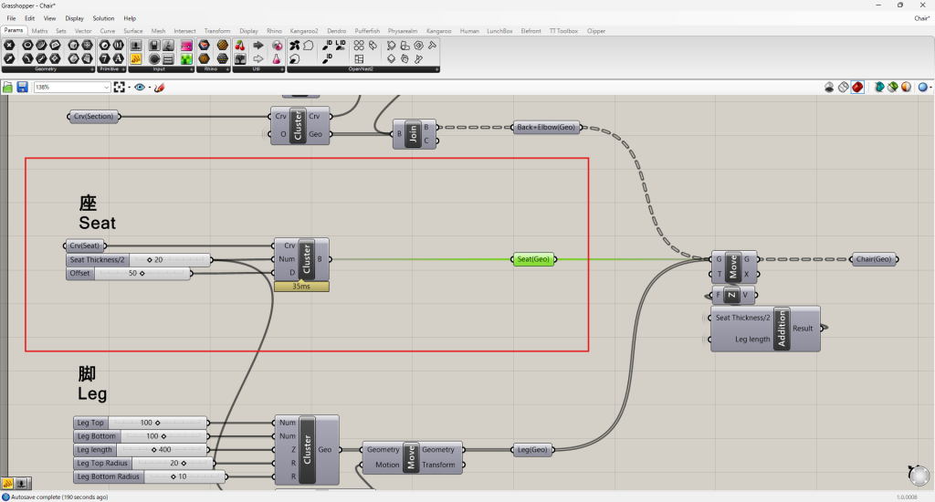 HOME > Tutorial > Rhino+Grasshopper > Rhino+Grasshopper 【Rhino+GH】チェアのモデリングをGrasshopperで効率化しよう 2025年3月7日 チェアの自動モデリング 座のモデリング 「Seat Thickness/2」(座面の厚みの1/2)を20mmに設定します。 「Offset」を調整して座面の丸みを設定します。 背と肘のモデリング Crv(Top)=背の上端ラインCrv(Bottm)=背の下端ラインCrv(Section)=肘の立面ライン 脚のモデリング 脚 幕板 「Hight」と「Width」を設定します。 Bakeする Chairダウンロード -Rhino+Grasshopper -Grasshopper, Rhinoceros8