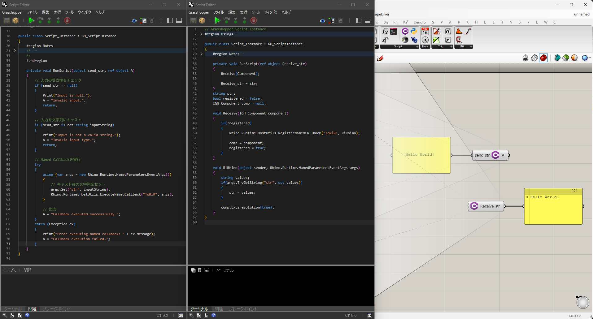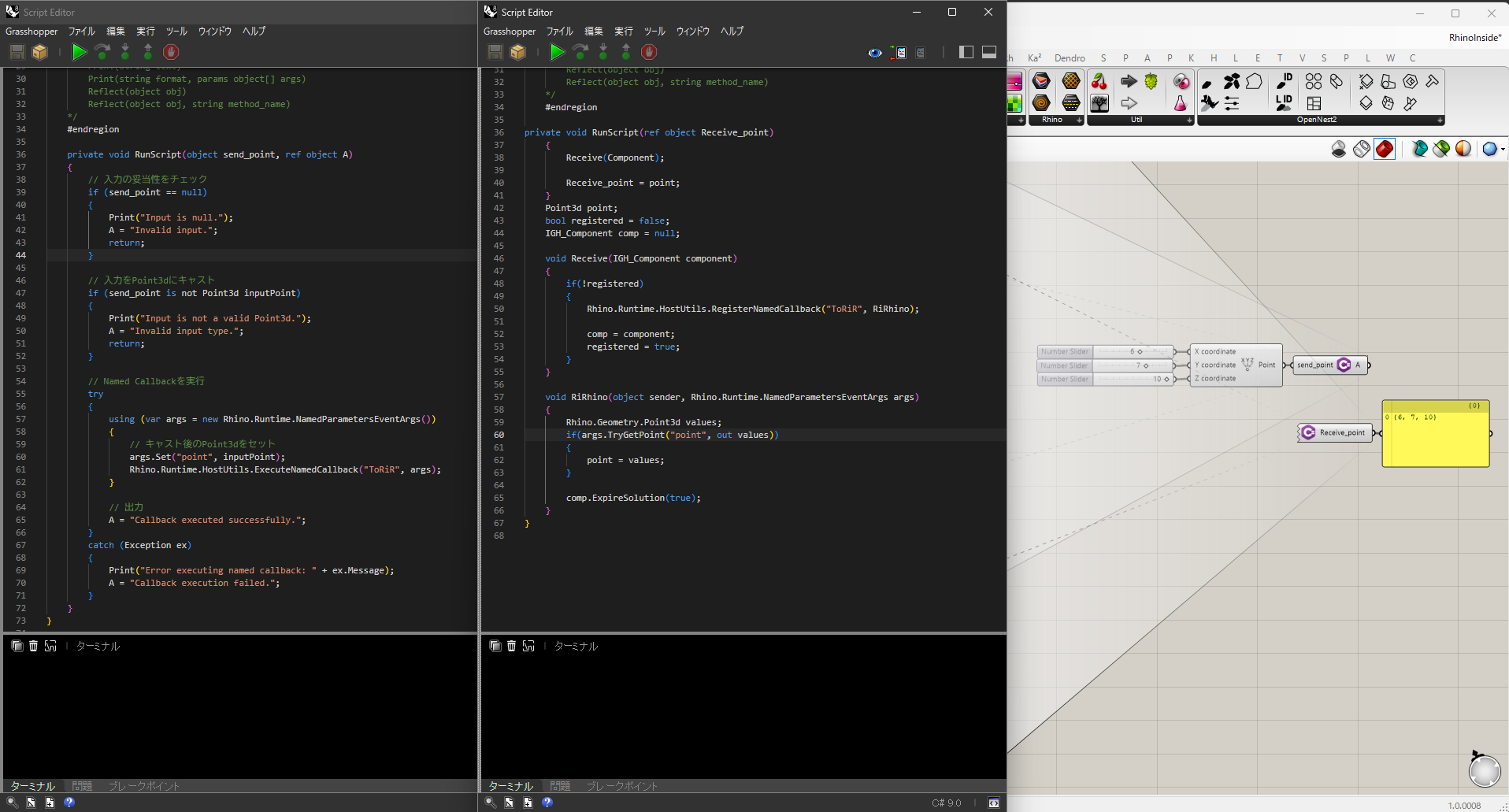 Rhinoのドキュメント(モデルファイル)の操作や、ユーザーのアクション(例:オブジェクトの追加や削除)に反応するカスタムイベントを作成できます。 - Grasshopperとの連携: