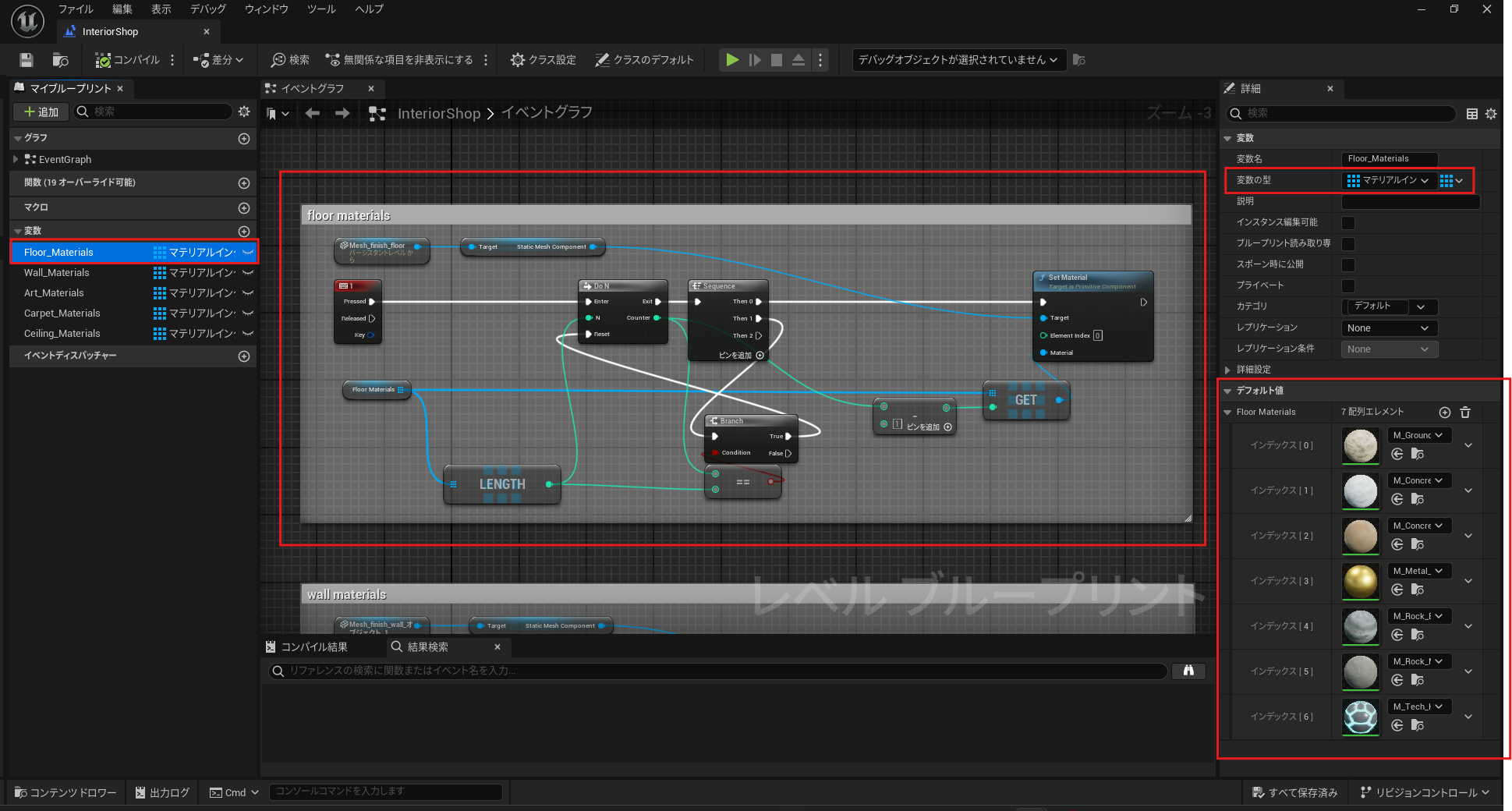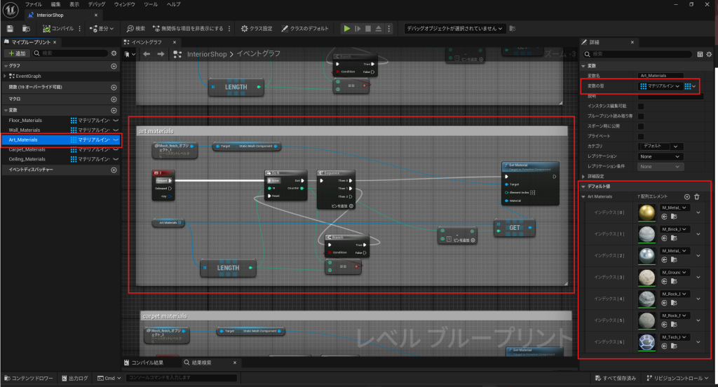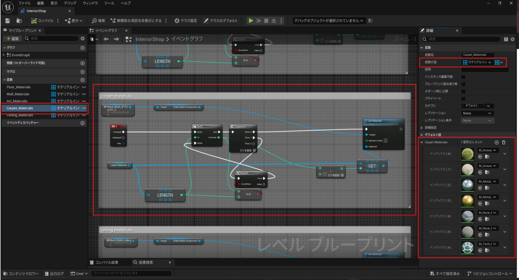 - ブループリントの作成: ブループリント内で「Set Material」ノードを使用し、特定のアクションに応じてマテリアルを変更するように設定します。例えば、「F」キーを押すと床のマテリアルが切り替わるように設定します。