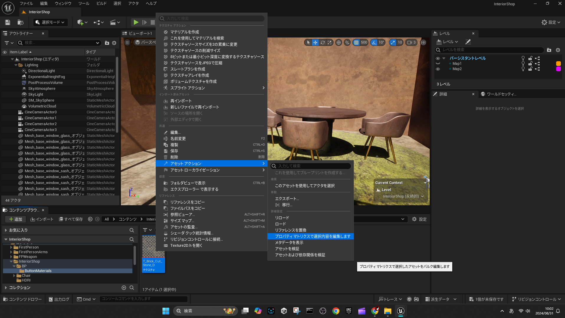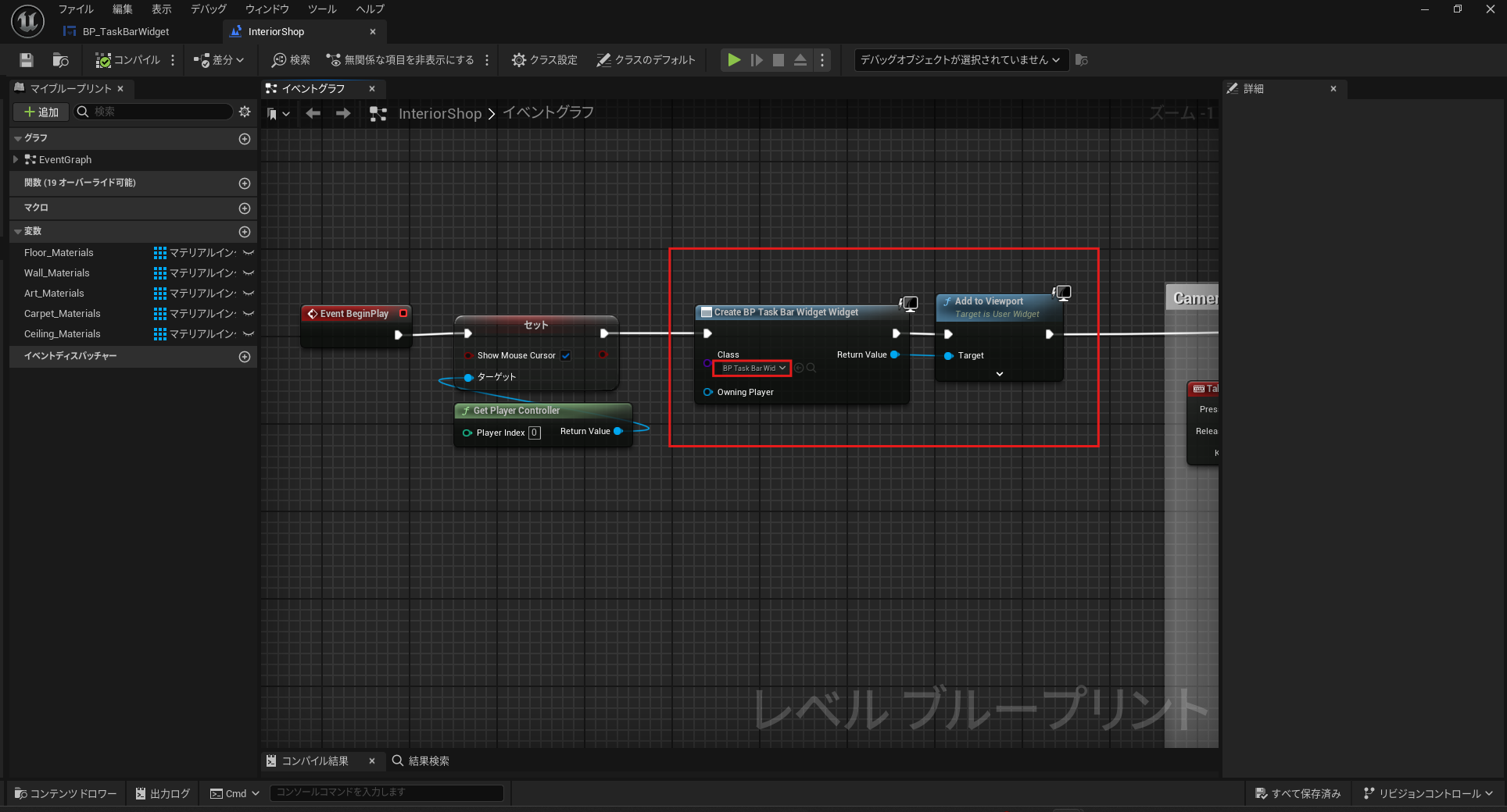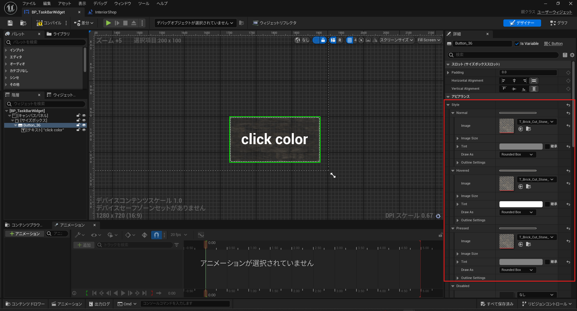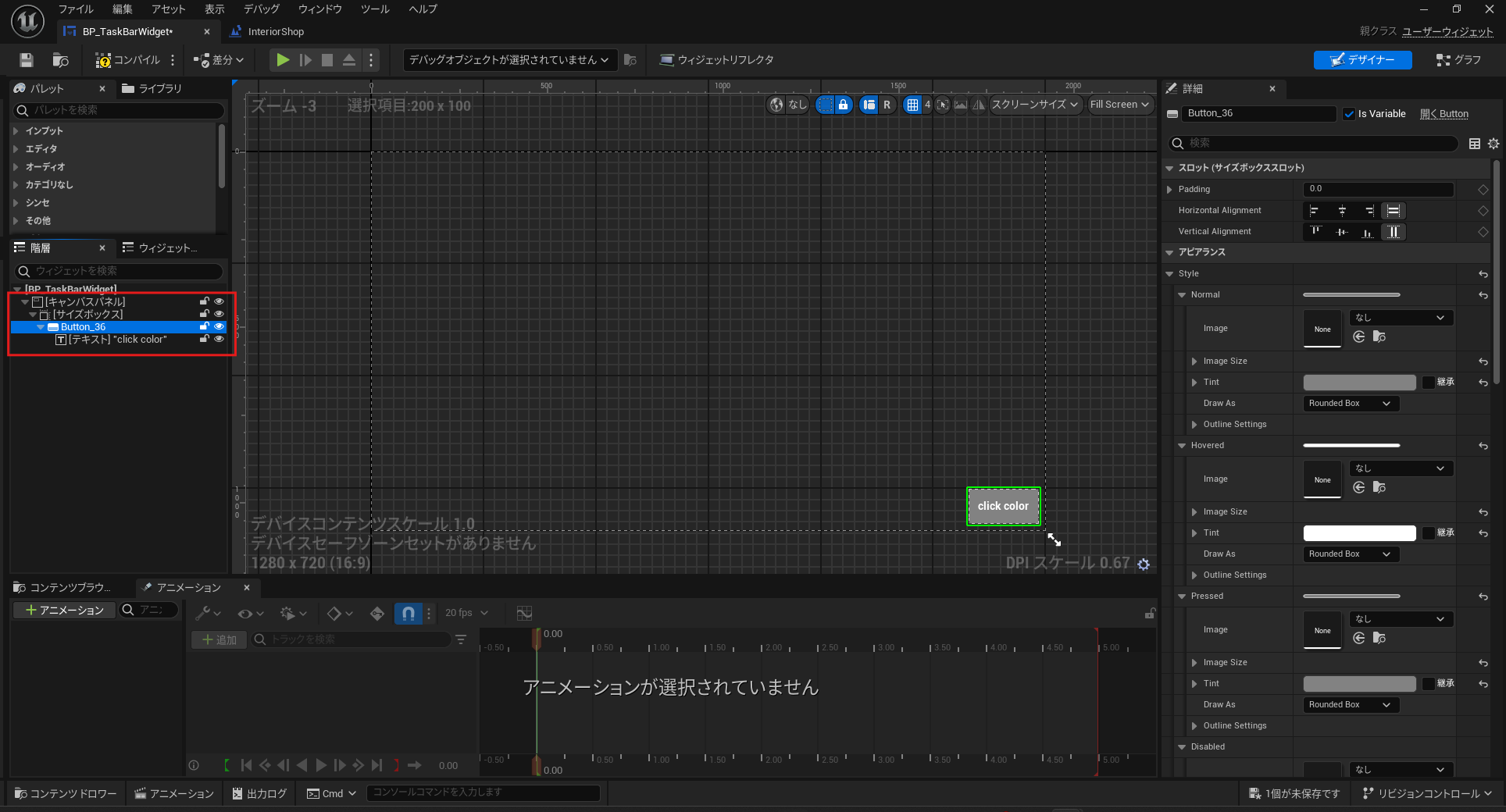 - ブループリントでの制御: ボタンを押した際のアクションを「OnClicked」イベントで定義し、対象のオブジェクトの色を変更するコードを記述します。