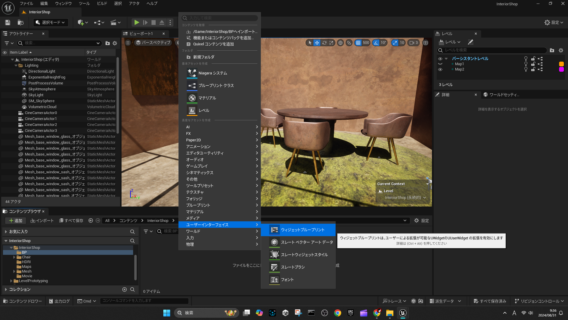 - ウィジェットの作成: 「User Interface」から「Widget Blueprint」を作成し、ボタンやスライダーを配置します。
