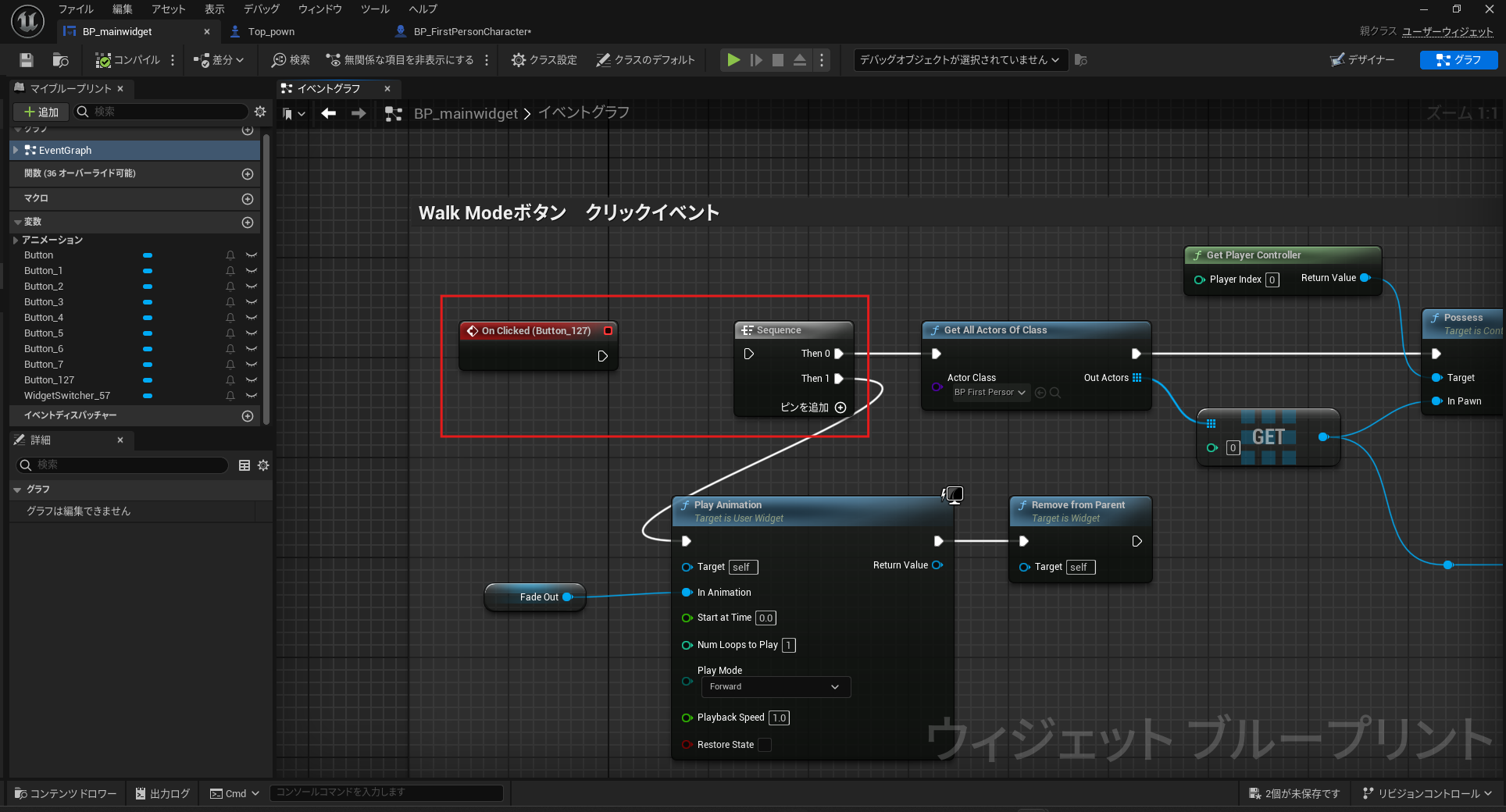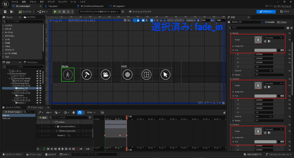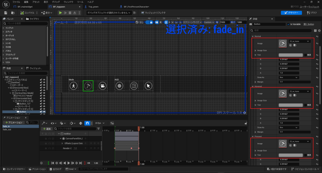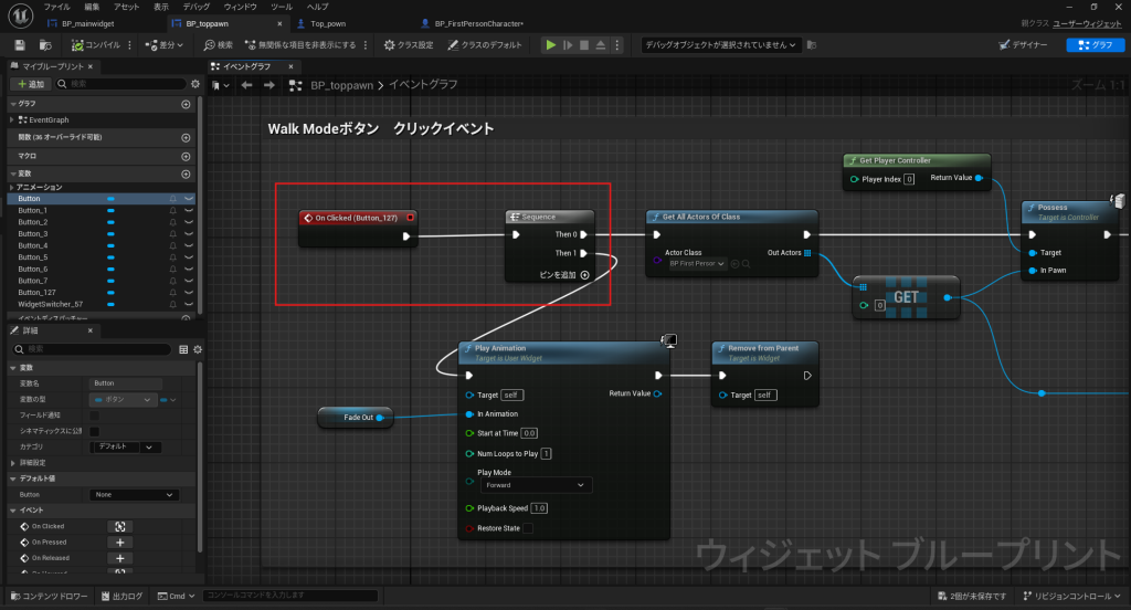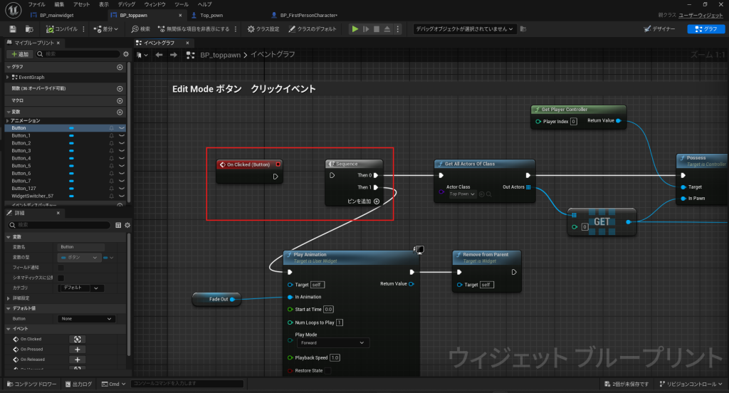 - BP_toppawn ウィジェットを開き、「ワーク」ボタンを再度有効化します。