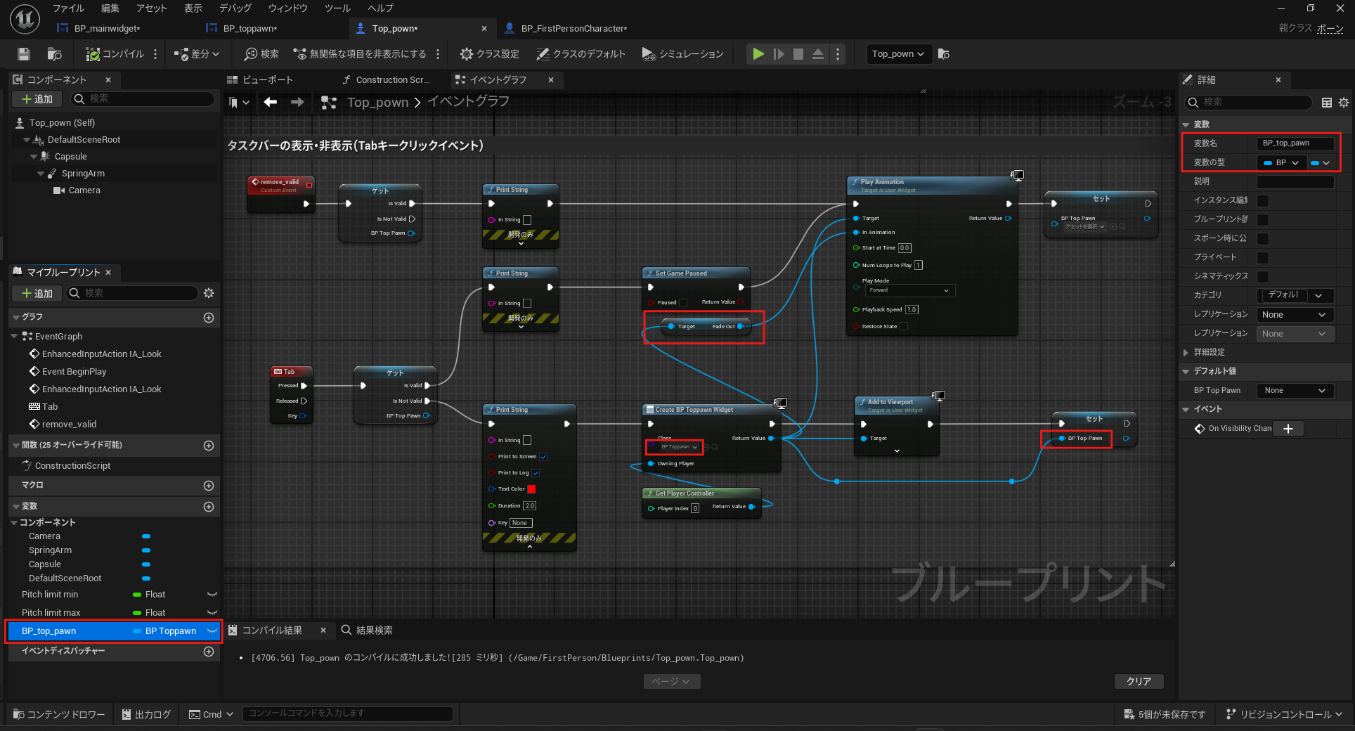- BP_Main_Widget の変数名を BP_toppawn に変更し、再コンパイルします。