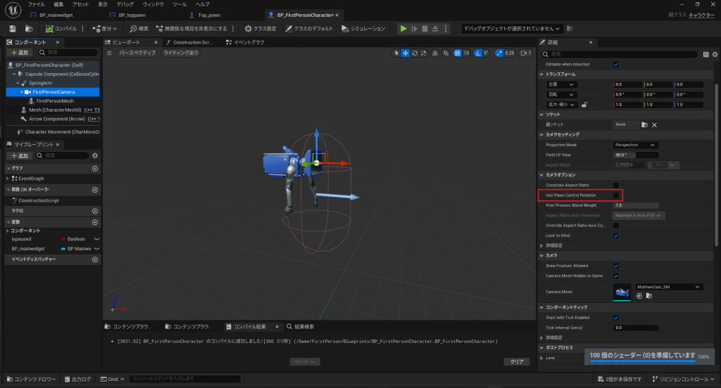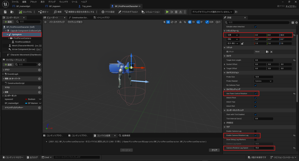 - ビューポートタブで FirstPersonCamera の位置と回転をゼロに設定し、スプリングアームのターゲットアーム長をゼロに設定します。