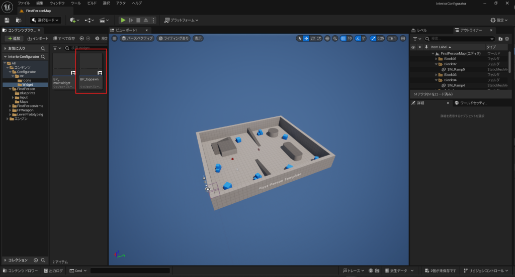 - 次に、コンテンツブラウザの「ウィジェット」フォルダに移動し、BP_Main_Widget を複製して BP_toppawn という名前に変更します。