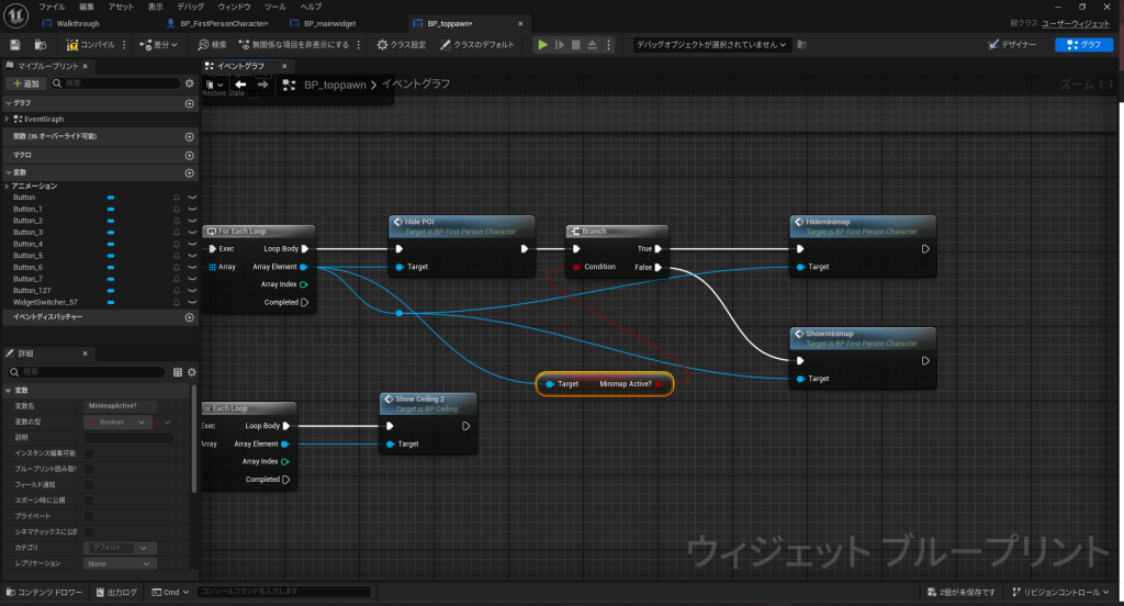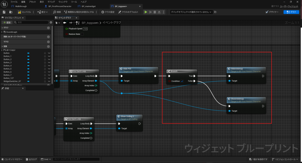 イベントグラフで、Hide POIから「Branch」で「Hideminimap」「Showminimap」のイベントをセットします。