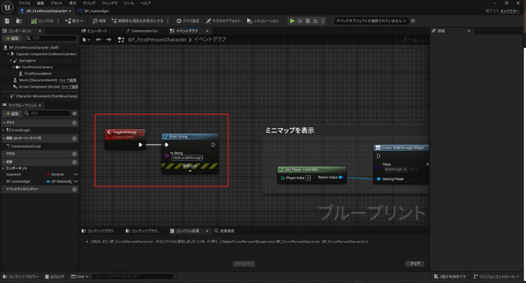 カスタムイベント「ToggleMinimap」に「Print String」を接続し「Hello walkthrough」を出力されるようにします。