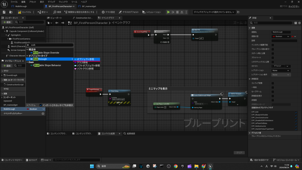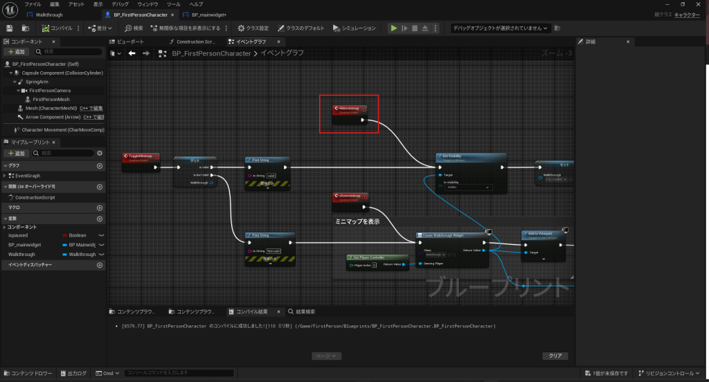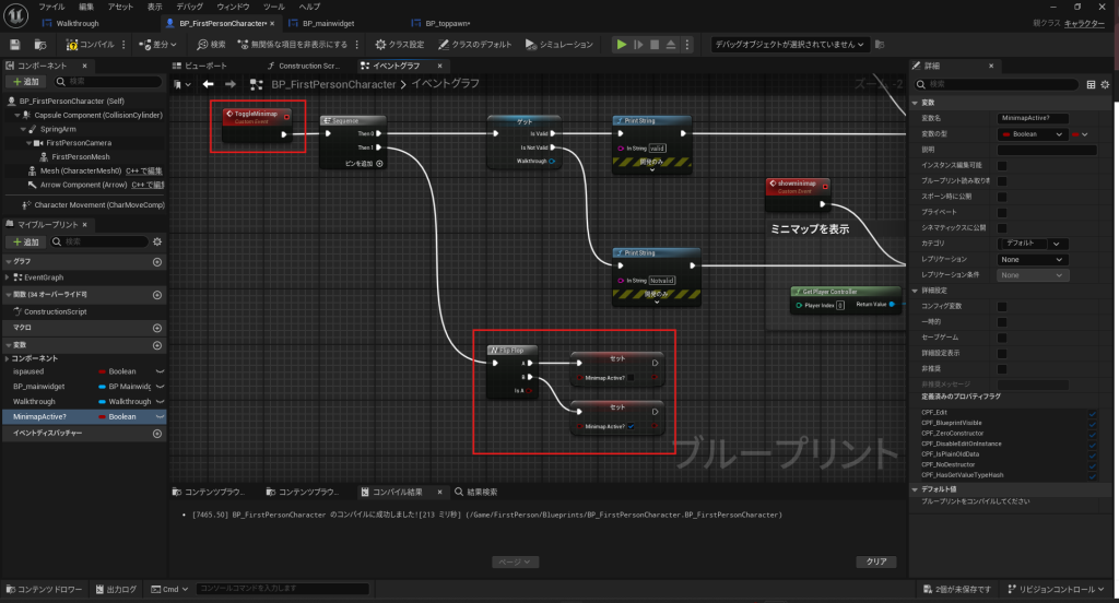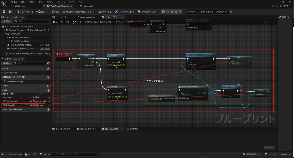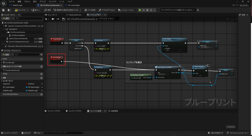 WalkthroughをGETして「検証済みゲットに変換」します。「ToggleMinimap」を接続し「Is Valid」「Is not Valid」にそれぞれ「Print String」を配置接続します。