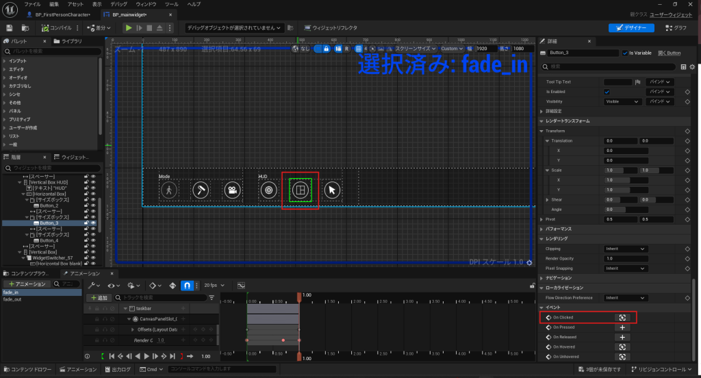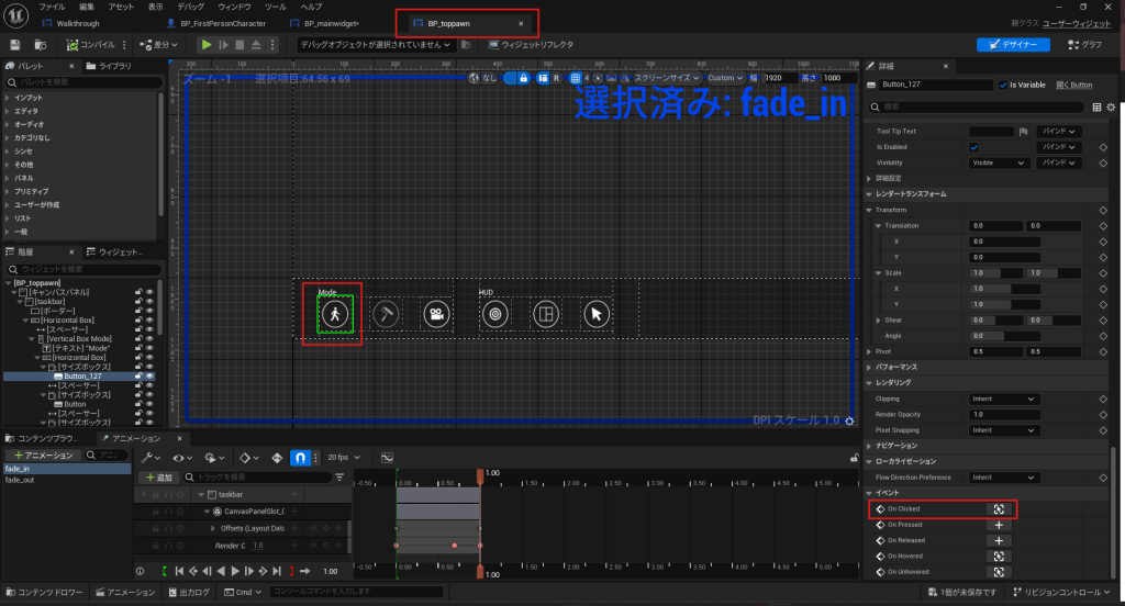 BP_mainwidgetを開き、「FloorPlan」ボタンを選択し、イベントの「On Clicked」をクリックします。