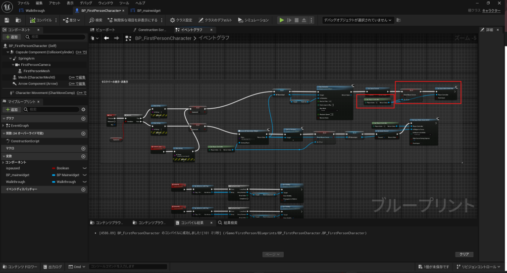 「Blueprints」内の「BP_FirstPersonCharacter」を開きます。