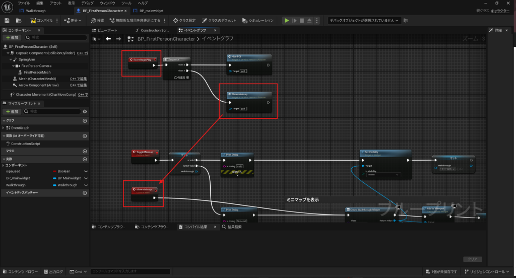 BP_FirstPersonCharacterのイベントグラフで「Sequence」のThen1のピンの接続を切ります。