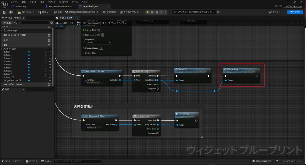 「BP_mainwidget」に戻り、POIボタンが押された時に「HideMinimap」イベントを実行するように設定します。これにより「トップビュー」「オブジェクトビュー」「マテリアルセレクトビュー」でミニマップが非表示になります。