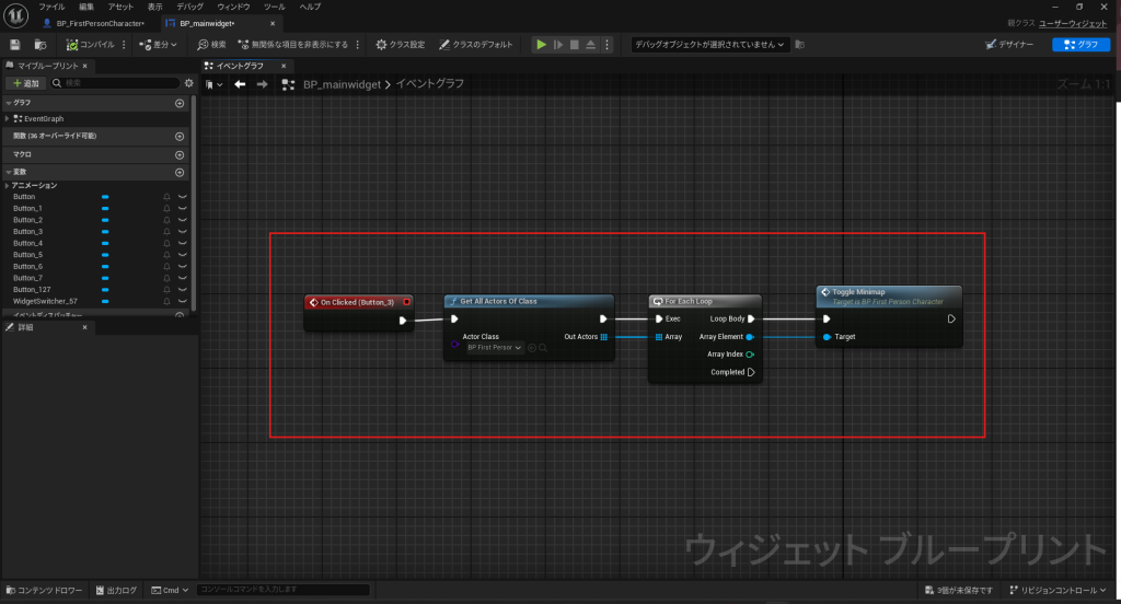 BP_mainwidgetのイベントグラフで「Get All Actors Of Class」「For Each Loop」「Toggle Minimap」を配置しそれぞれ接続します。