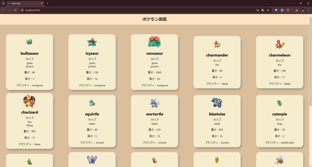 Step1_React環境構築:ひな形作成 Step2_PokeAPIでデータを取得 Step3_ポケモンの詳細なデータを取得 Step4_Cardコンポーネントを作成しポケモンをグリッドで表示する ...